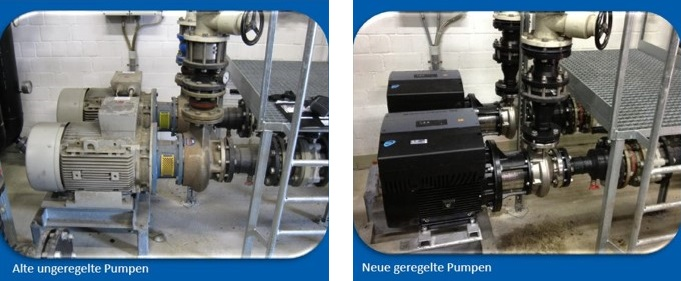 Die alte ungeregelte Pumpe mit 35 kW Motor verbrauchte pro Jahr 110.000 kWh. Die neue geregelte Pumpe mit 15 kW Motor verbraucht bei gleicher Betriebsvorgabe pro Jahr 64.602 kWh.